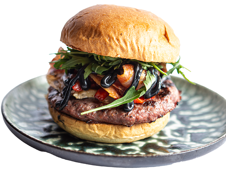 Pan brioche, 180 gr. ternera black angus, queso gorgonzola, rúcula, setas, bacon,