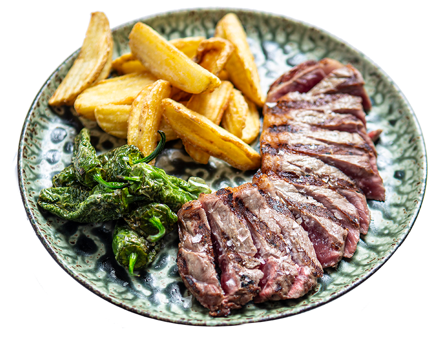 Lomo alto de ternera a la parrilla con patatas y pimientos de padrón